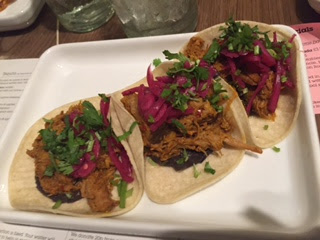 Among the tacos I particularly liked the pork pibil, which is slow-cooked marinaded pork with pink pickled onions, served in a toasted tortilla. The tostadas were open tortillas topped with different things like chicken Caesar or black beans; I loved the sweet potato and feta cheese taquito, which was a rolled-up tortilla. Quesadillas are toasted tortilla sandwiches, filled with things like chicken and cheese. Each dish is priced around £3-£4 and usually contains three of each item so they are easy to share. It was great being able to try different flavours together and to learn the meaning of terms that are usedl I was pleased that the food wasn’t too spicy either. I also sampled a couple of cocktails which were very good!