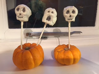 The shapes came out of the mould very easily - there was a skull, a ghost, a pumpkin and a ball that you can decorate as an eyeball. I stuck the end of some cake pop sticks into some melted candy melts and put them into the cake balls and left them to set.